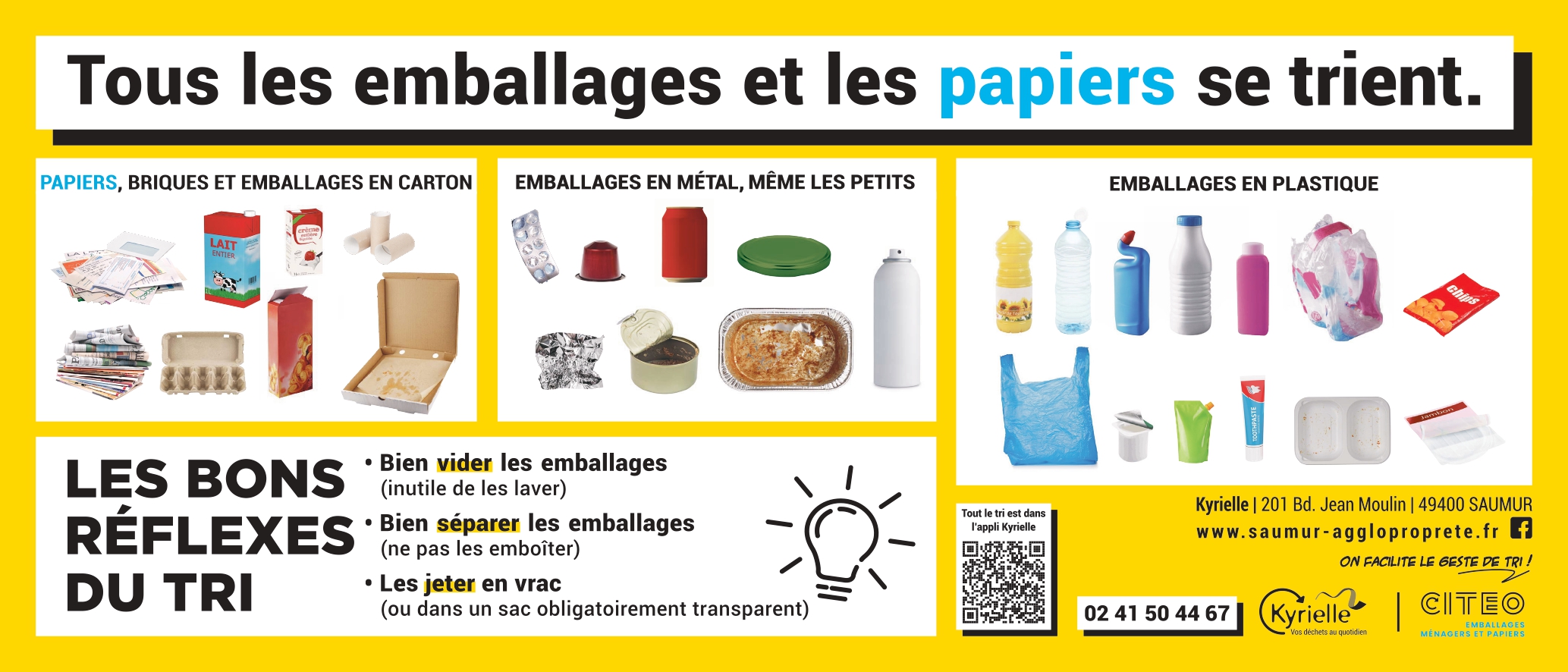 LES PAPIERS doivent être jetés avec LES EMBALLAGES dans le même bac (jaune) ou en point d’apport volontaire.