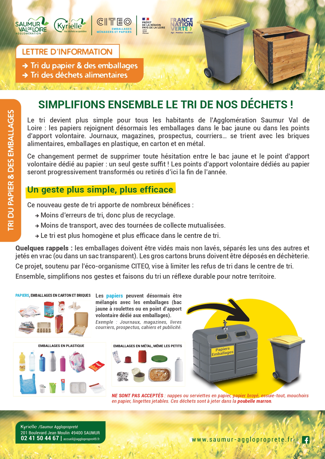 Ce nouveau tri concerne les 45 000 foyers de l’Agglomération Saumur Val de Loire, qu’ils soient équipés de bacs roulants individuels ou qu’ils aient recours aux points d’apport volontaire.
